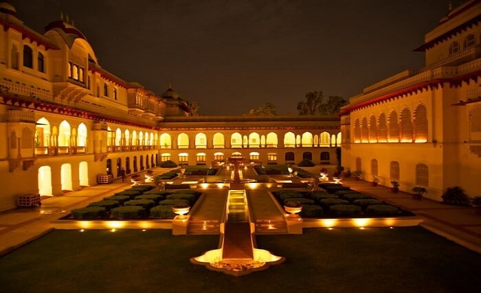 The Rambagh Palace in Jaipur, Rajasthan is the former residence of the Maharaja of Jaipur and now a hotel, located 5 miles (8.0 km) outside the walls of the city of Jaipur on Bhawani Singh Road.